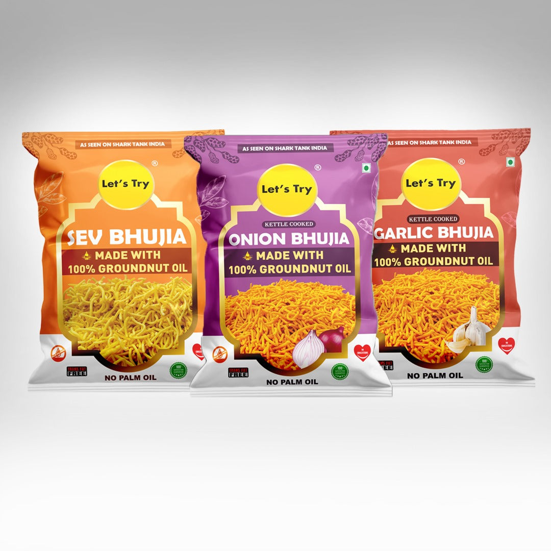 Let's Try Bhujia Combo is a delicious and spicy snack pack with three different types of Bhujia.